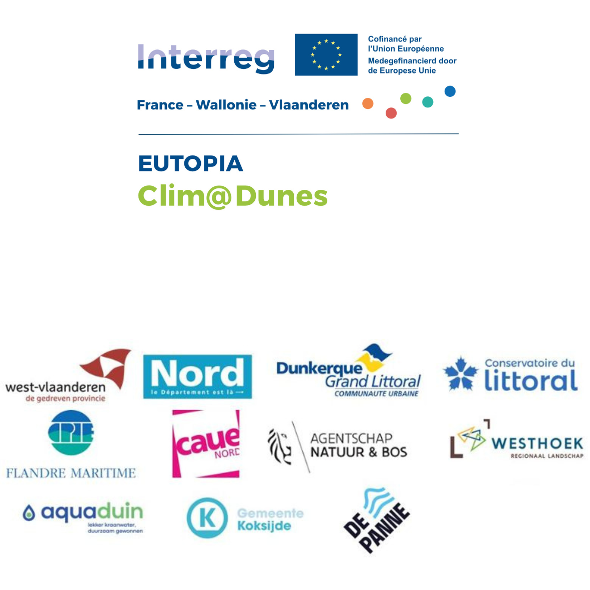 Binnen het Interreg France-Wallonie-Vlaanderen-programma bundelen 11 partners- 6 Vlaamse en 5 Franse- hun krachten om de duingebieden in deze grensoverschrijdende regio te versterken. Clim@Dunes maakt deel uit van de projectenportefeuille EUTOPIA.